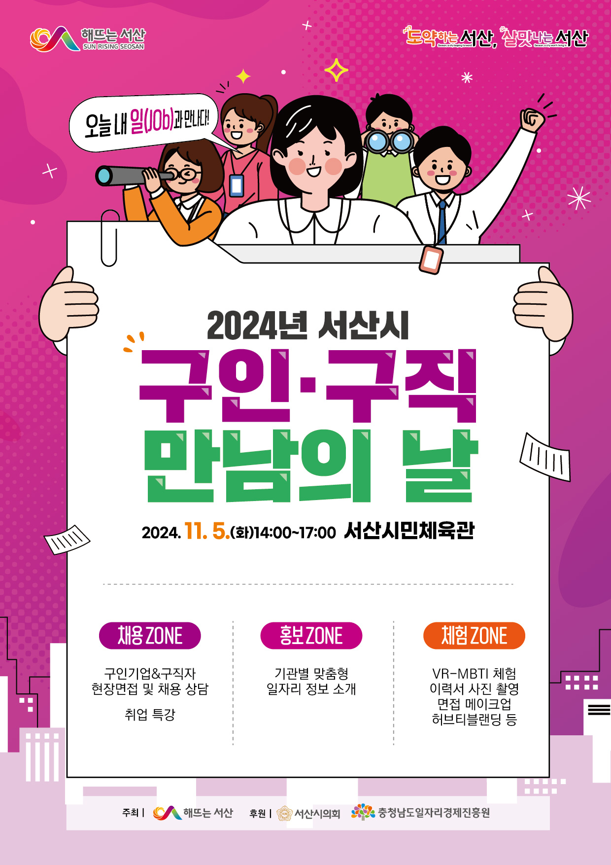 구직자와 기업체의 만남의 장인 이 2024년 11월 5일(화) 오후 2시부터 5시까지 서산시민체육관에서 개최된다.취업을 희망하는 시민은 누구나 참여할 수 있다.(참고_홍보자료)
