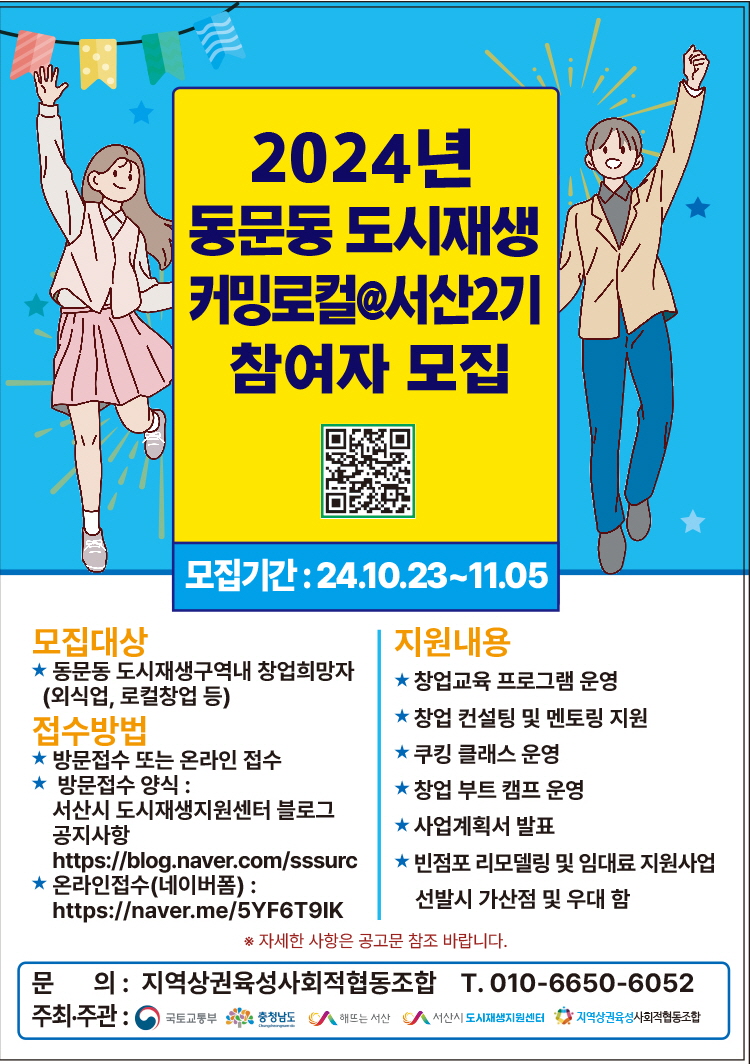 서산시는 2024년 동문동 도시재생 창업교육프로그램 『커밍로컬@서산 2기』 를 모집(30며)한다.교육기간은 오는 11월 11일(월)부터 12월 13일(금)까지 서산청년마당(서산시 번화1로 19)에서 진행된다. 교육내용은 창업교육프로그램 운영 및 컨설팅·멘토링지원이다. 신청자격은 동문동 도시재생 구역 내 창업 희망자(외식업