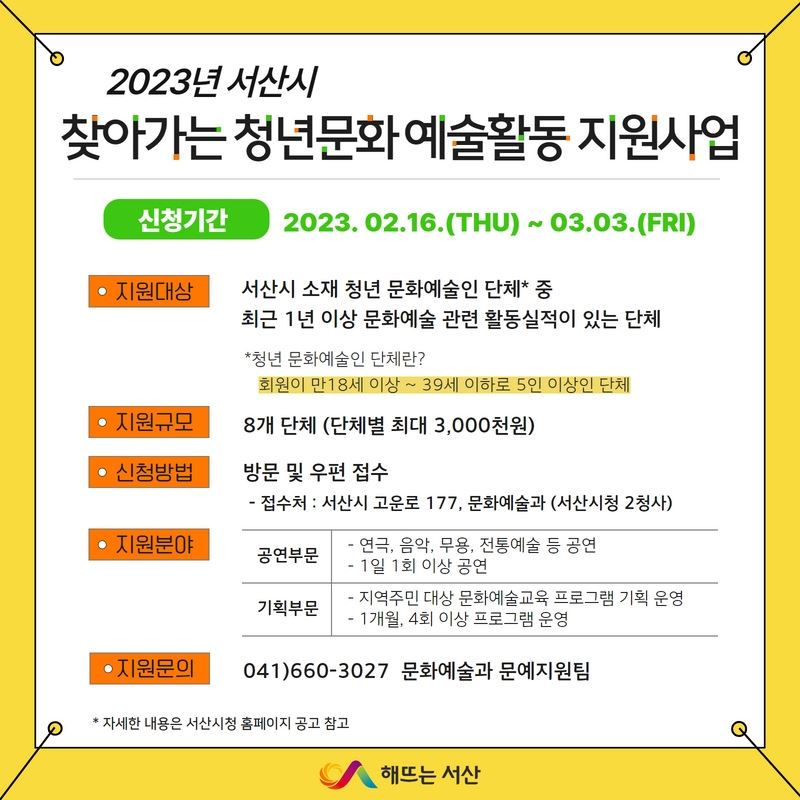 서산시는 청년 문화예술 활성화를 위해 오는 3월 3일까지 ‘청년 문화단체 예술활동 지원사업’ 참여단체 8팀을 모집한다고 밝혔다.
